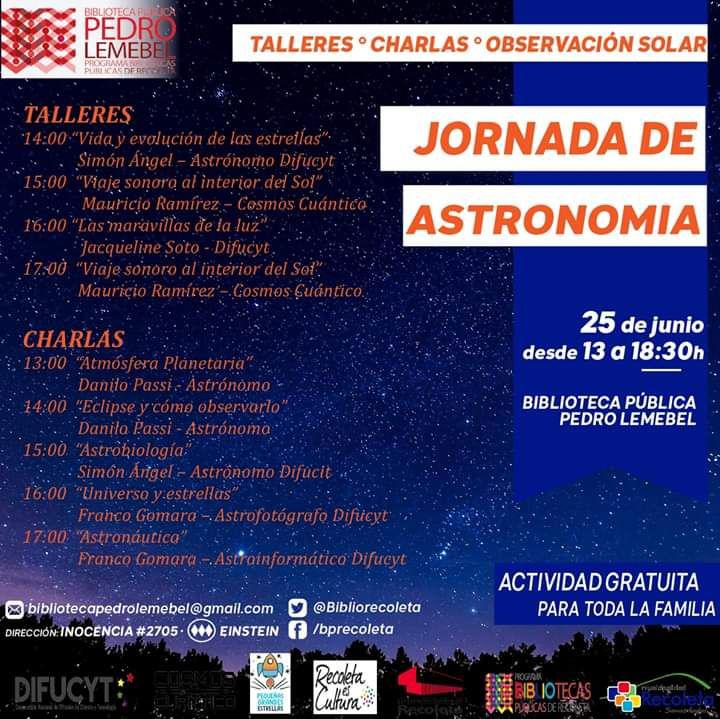 Este Sábado 25 de Junio se realizará una jornada astronómica en la Biblioteca Pública Pedro Lemebel en la comuna de Recoleta.